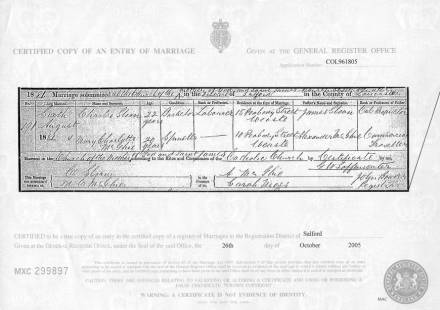 Certificate shows that on August 6th 1881 Charles Sloan married Mary Charlotte